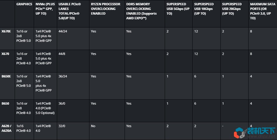 不過A620、B650、X670在擴展性方面還是有區別的,比如PCIe通道數量、USB端口數量等,詳見下圖