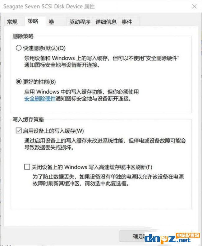 4、選擇“更好的性能”后,把“寫入緩存策略”部分的“啟用設備上的寫入緩存”選擇框選中,但不選中第二個選項,否則更容易在意外斷電或拔出時出現數據丟失,如下圖所示。