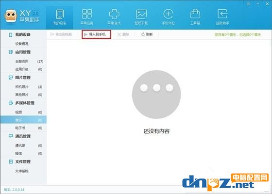 1、我們先打開XY蘋果助手選擇【我的設備】-【多媒體管理】-【音樂】,暫時此iPad里沒有任何音樂,點擊【導入到手機】按鈕。