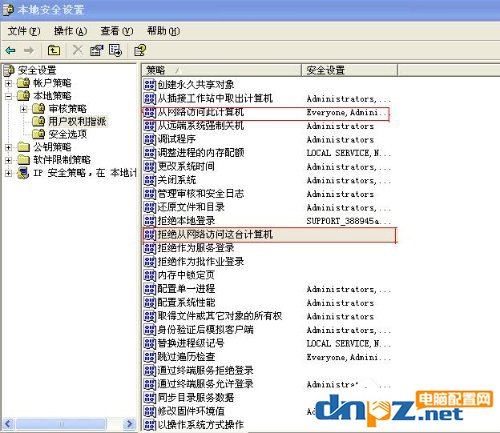 二、控制面板→管理工具→本地安全策略→本地策略→用戶權利指派里,“從網絡訪問此計算機”中加入guest帳戶,而“拒絕從網絡訪問這臺計算機”中刪除guest帳戶,如圖所示: