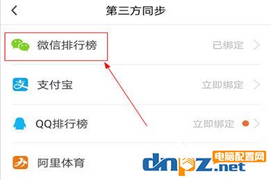 2、在“第三方同步”功能界面中可以看到支持綁定微信、支付寶、QQ、阿里體育等社交平臺。這里我們選擇“微信排行榜”的綁定。